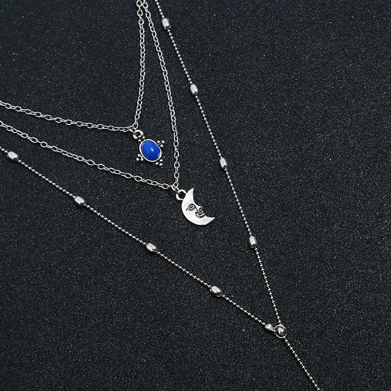 Elegant blue stone necklace triple layered moon pendant crafted with alloy silver plated chain and gol blue stone design looks beautiful. Lightweight, stylish and perfect for layering, festive looks,office wear,parties and vibe.
