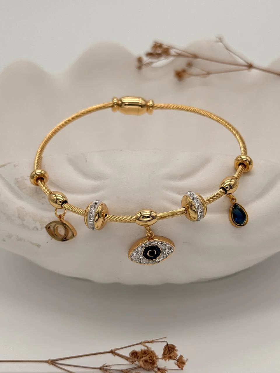 Design: Twisted wire bangle with evil eye and charm detailing